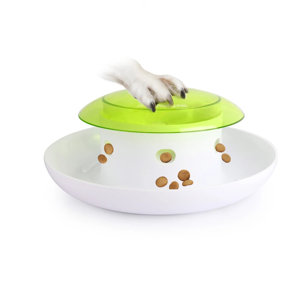 Met één druk op de knop voorziet deze dispenser je hond van voer of snacks! Dit is een leuke manier om je hond maaltijden of snacks te geven. Je hond hoeft alleen maar met de poot op de knop te drukken en de lekkernijen vallen in het opvangbakje.